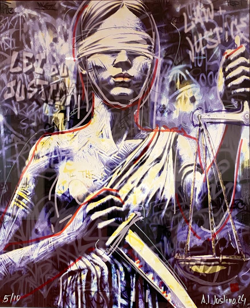 A.I. Justino ist ein faszinierender Künstler, der aus einfachen Verhältnissen stammt und sein Jurastudium abbrach, um sich voll und ganz der Malerei zu widmen. Seine Werke bieten eine frische Interpretation der blinden Richterin „Justitia“ und thematisieren den ewigen Konflikt zwischen Recht und Gerechtigkeit. Diese Neuinterpretationen fordern den Betrachter auf, über die oft willkürlichen Vorstellungen von Recht nachzudenken.