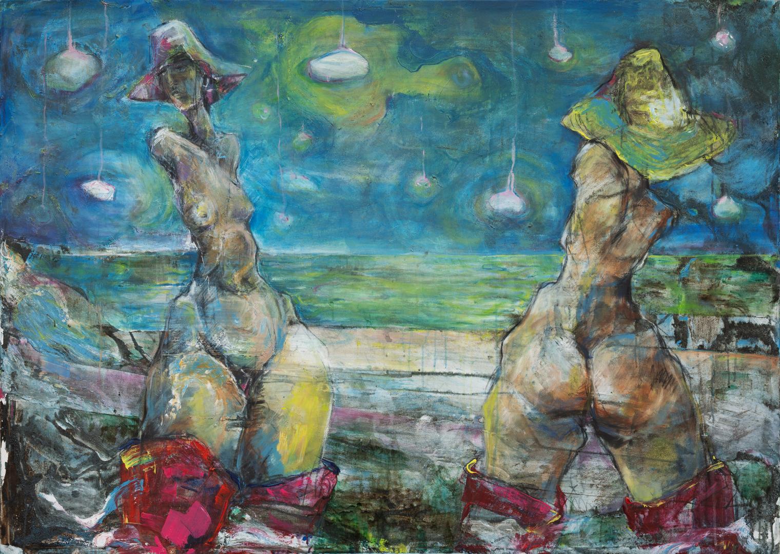 Auch in der Malerei bleibt der Mensch zentral. Auf der Leinwand entstehen Körperlichkeit und Raum durch das Zusammenspiel von Acryl, Bitumen, Kohle, Wasser und Fläche. Müllers Werke sind sinnlich erfahrbar, direkt und offen für neue Perspektiven – sie fragen danach, wie der Mensch sich in seiner Umwelt erfährt und sie zugleich mitgestaltet.